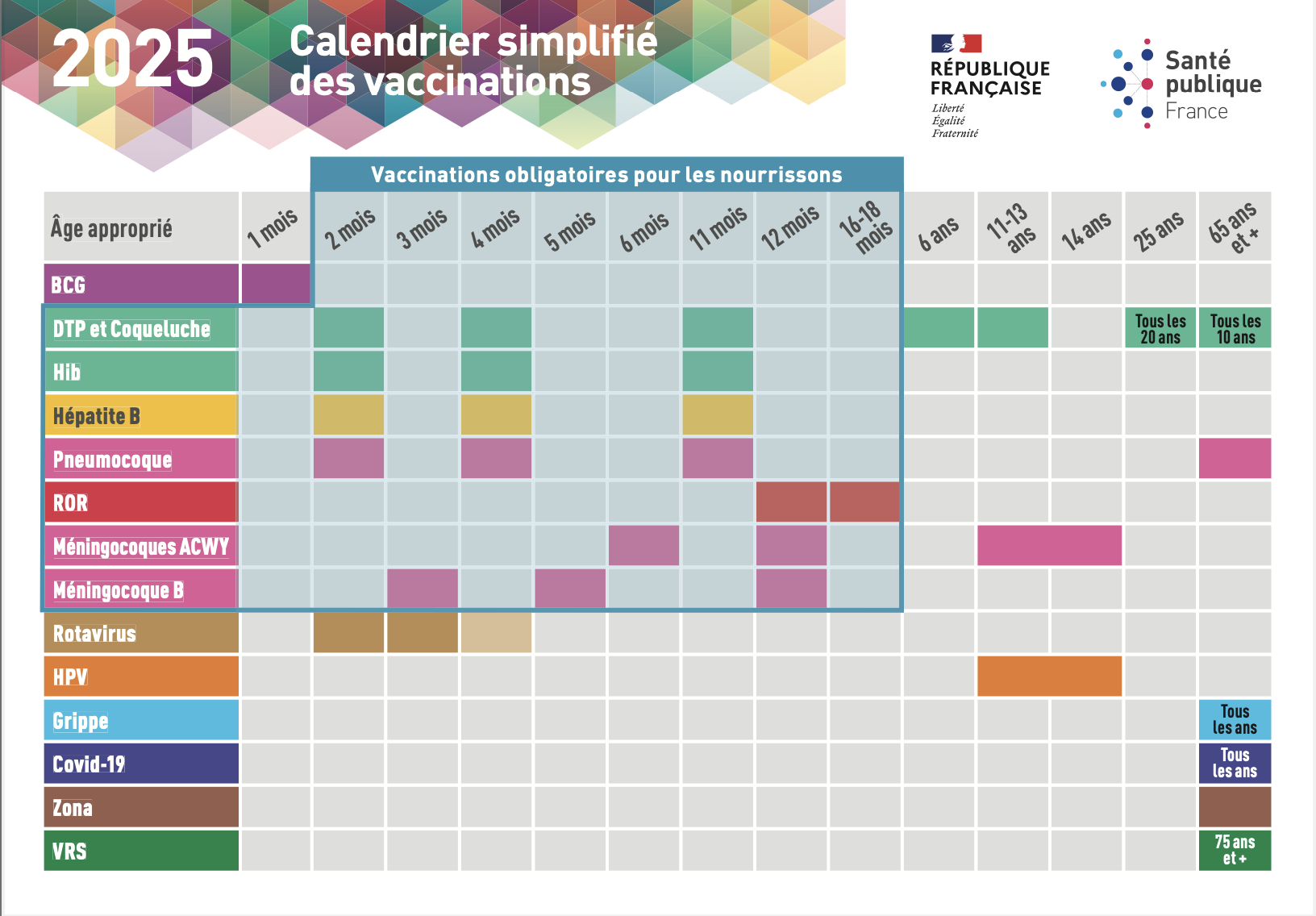 Depuis janvier 2018, 11 vaccinations sont obligatoires pour les enfants de moins de 2 ans en France métropolitaine : diphtérie, tétanos, poliomyélite(ces 3 vaccinations étaient déjà obligatoires chez l’enfant avant 2018), coqueluche, infections à Hæmophilus influenzae de type b (Hib), hépatite B, infections à pneumocoque, rougeole, oreillons et rubéole (ces vaccinations sont seulement recommandées pour les enfants nés avant le 1er janvier 2018). La vaccination contre les infections à méningocoque C actuellement obligatoire pour les nourrissons de plus de 2 mois va être remplacée par la vaccination contre les méningocoques ACWY en janvier 2025 et la vaccination contre le méningocoque B seulement recommandée auparavant devient également obligatoire. Sauf contre-indication médicale reconnue, elles sont pratiquées dans les 18 premiers mois de l’enfant.