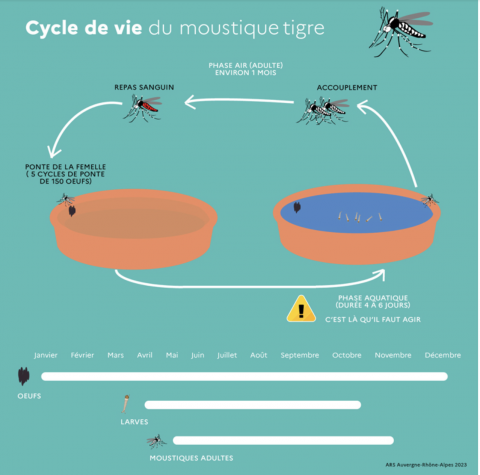 Le moustique tigre adulte réapparait chaque année à la fin du printemps. Avant cela, il a veillé à coloniser les contenants naturels ou artificiels de toutes formes pour constituer sa zone de ponte (son gîte larvaire) parfois même pendant l’hiver : coupelles pour pots de fleur, pneus usagés, jouets, récupérateurs d’eau de pluie, mobiliers de jardin, piscines non entretenues, bâches, etc.).