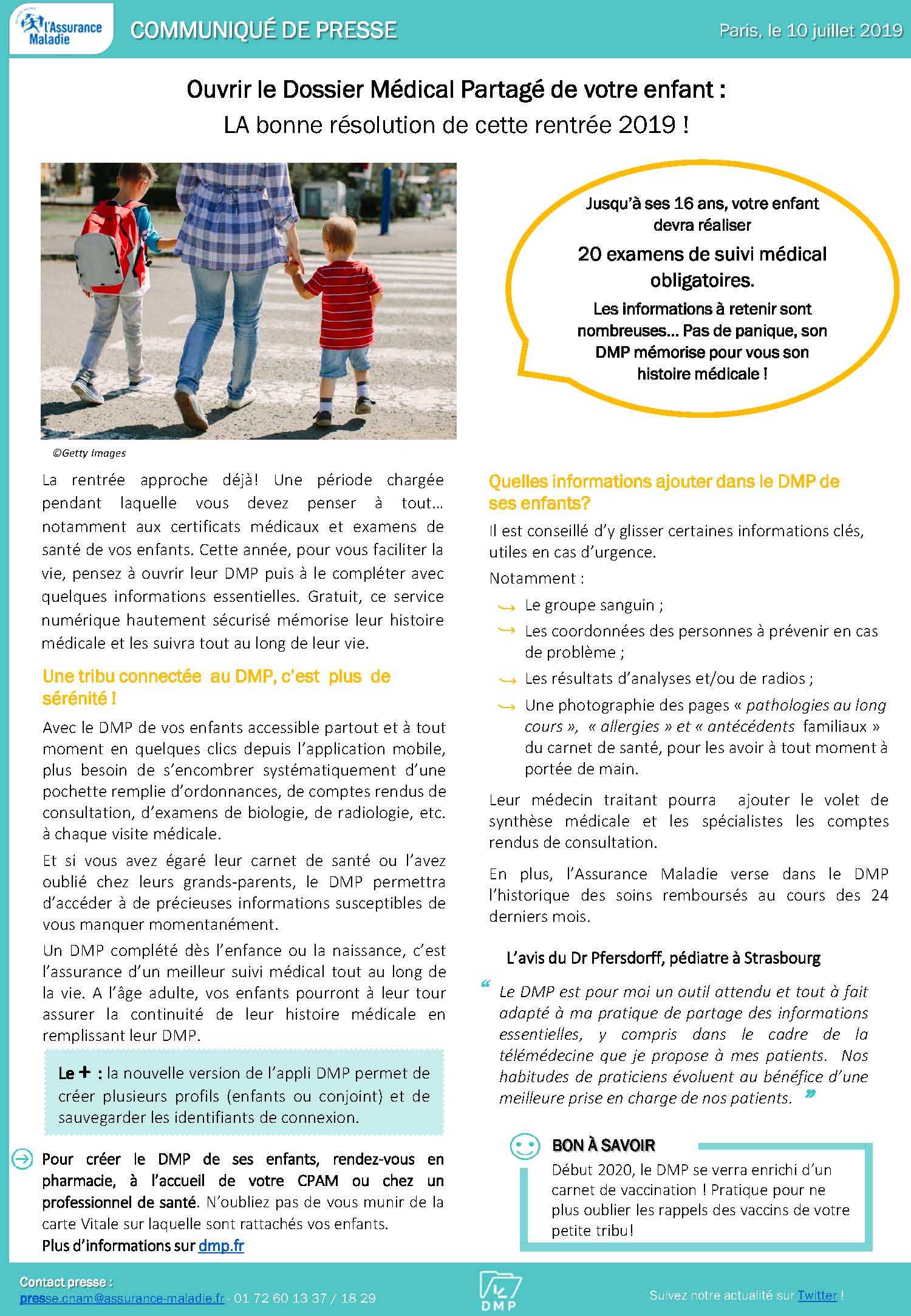 La bonne résolution de cette rentrée 2019 ! La rentrée approche déjà! Une période chargée pendant laquelle vous devez penser à tout…notamment aux certificats médicaux et examens de santé de vos enfants. Cette année, pour vous faciliter la vie, pensez à ouvrir leur DMP puis à le compléter avec quelques informations essentielles. Gratuit, ce service numérique hautement sécurisé mémorise leur histoire médicale et les suivra tout au long de leur vie.
